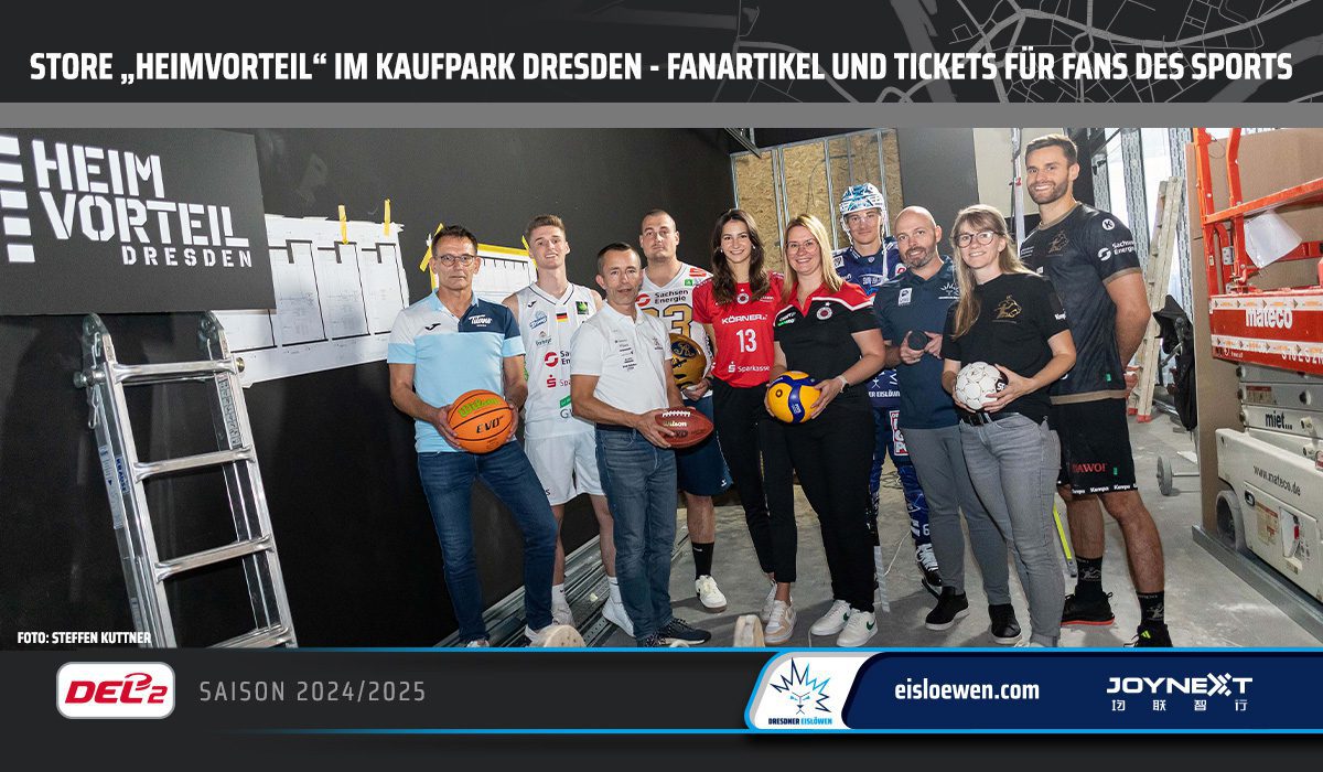Gemeinsame Sache: Die Dresdner TeamSport-Vereine unterstreichen ihre Zusammenarbeit und sorgen für ein Achtungszeichen. Unter der Flagge der Sportbetriebsgesellschaft Saegeling GmbH und dem Namen „Heimvorteil“ setzen die DSC Volleyball Damen, die Dresden Monarchs, der HC Elbflorenz, die Dresdner Eislöwen und die Dresden Titans erstmals einen gemeinsamen Shop um. Der Store im neuen Kaufpark Dresden in Nickern bietet eine Auswahl an Merchandising-Artikeln aller fünf Klubs und Tickets für alle Vereine.