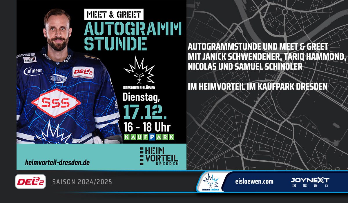 Am Dienstag, 17.12.2024 steigt die nächste Eislöwen-Autogrammstunde im Heimvorteil-Store im Kaufpark Dresden! Mit dabei sind Janick Schwendener, Tariq Hammond sowie die Zwillinge Nicolas und Samuel Schindler.