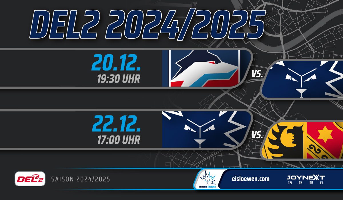 Am Wochenende vor Heiligabend wird in der DEL2 natürlich Eishockey gespielt. Für die Dresdner Eislöwen geht es am Freitagabend zu den Selber Wölfen. Spielbeginn ist 19:30 Uhr. Zum vierten Advent am Sonntag ist der ESV Kaufbeuren um 17 Uhr zu Gast.