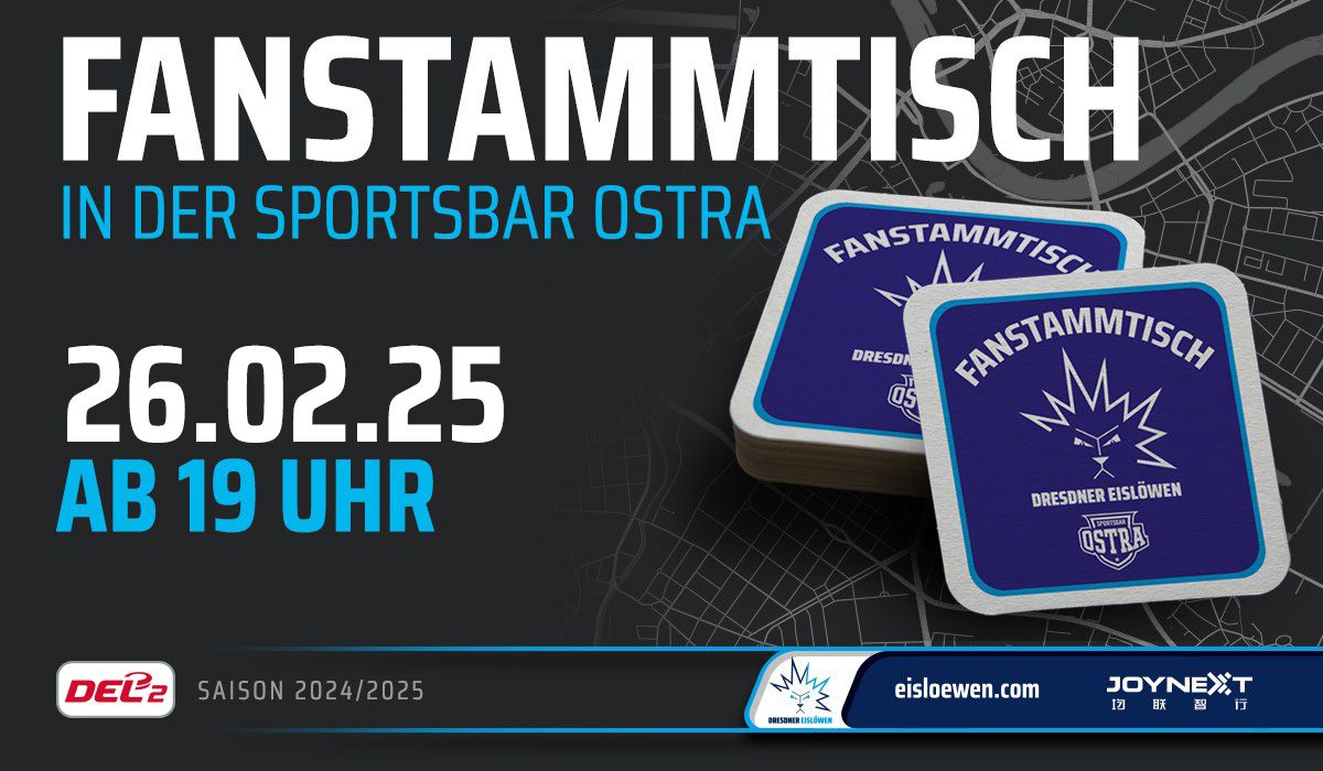 Am Mittwoch, 26.02.2025 wird es den nächsten Fanstammtisch der Dresdner Eislöwen geben. Neben Vertretern der Geschäftsstelle werden auch Cheftrainer Niklas Sundblad und Sportdirektor Matthias Roos Einblicke zum aktuellen Saisonverlauf geben und einen Blick auf die anstehenden Playoffs werfen.
