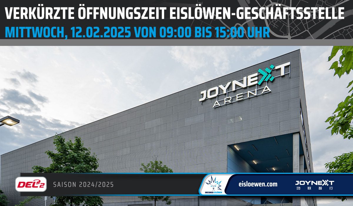 Aufgrund einer Veranstaltung kann die Geschäftsstelle der Dresdner Eislöwen am Mittwoch, 12. Februar 2025 nur verkürzt öffnen. Wir stehen euch von 09:00 bis 15:00 Uhr zur Verfügung!