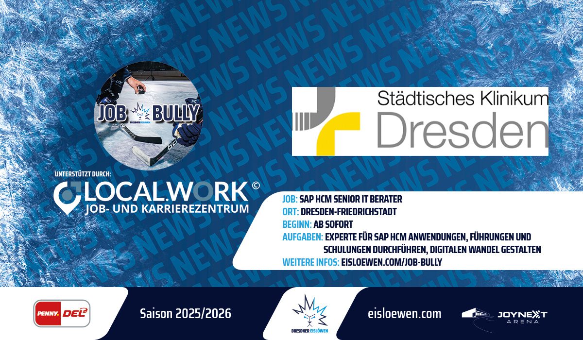 Gemeinsam mit LOCAL.WORK bekommen Eislöwenpartner und Firmen die Möglichkeit über die Webseite der Eislöwen neue Mitarbeiter zu gewinnen. Das nutzt auch unser Partner Städtisches Klinikum in Dresden-Friedrichstadt, auf der Suche nach SAP HCM Senior IT-Beratern. Das aktuelle Job-Angebot ist über eisloewen.com/job-bully einsehbar.