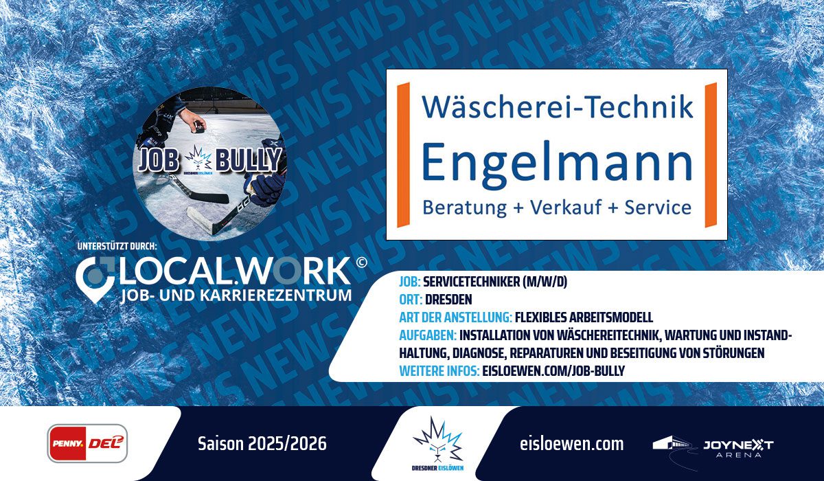 Gemeinsam mit LOCAL.WORK bekommen Eislöwenpartner und Firmen die Möglichkeit über die Webseite der Eislöwen neue Mitarbeiter zu gewinnen. Das nutzt auch unser Partner, die Wäscherei-Technik Engelmann auf der Suche nach einem Servicetechniker (m/w/d). Das aktuelle Job-Angebot ist über Stellenbeschreibung einsehbar.
