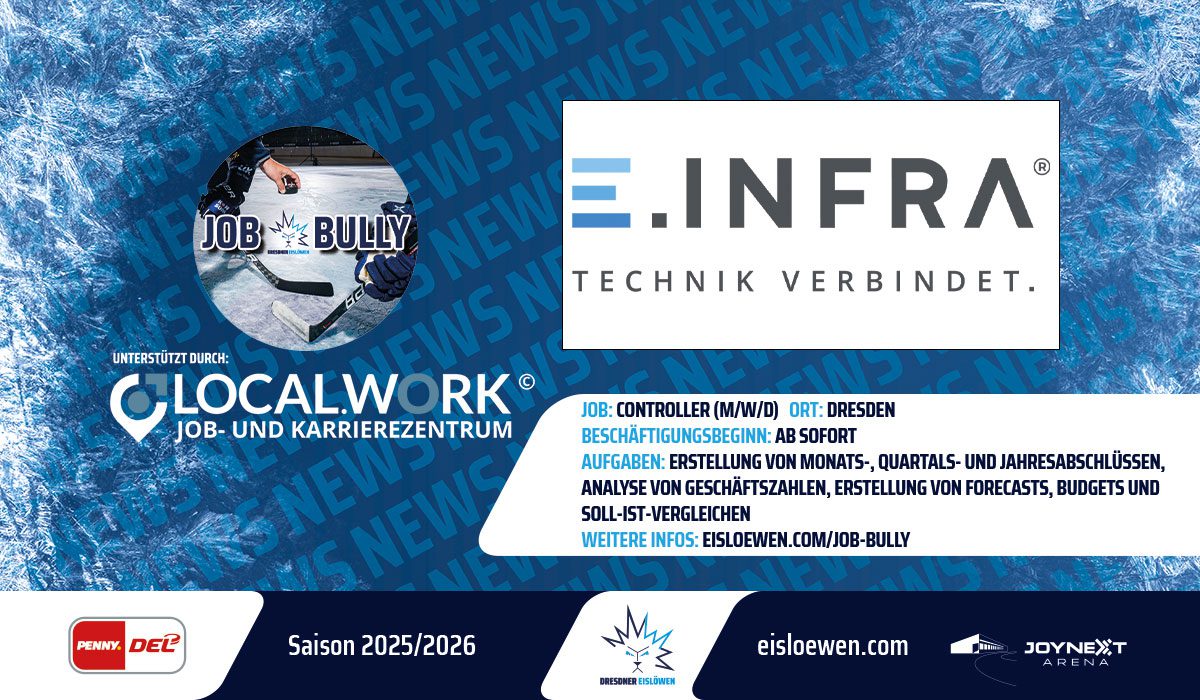 Gemeinsam mit LOCAL.WORK bekommen Eislöwenpartner und Firmen die Möglichkeit über die Webseite der Eislöwen neue Mitarbeiter zu gewinnen. Das nutzt auch unser Partner, die E.INFRA GmbH, auf der Suche nach einem Controller (m/w/d). Das aktuelle Job-Angebot ist über die Stellenbeschreibung einsehbar.