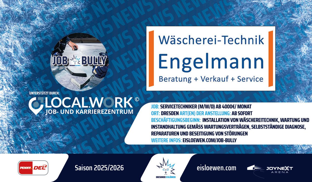 Gemeinsam mit LOCAL.WORK bekommen Eislöwenpartner und Firmen die Möglichkeit über die Webseite der Eislöwen neue Mitarbeiter zu gewinnen. Das nutzt auch unser Partner, die Wäscherei-Technik Engelmann auf der Suche nach einem Servicetechniker (m/w/d). Das aktuelle Job-Angebot ist über Stellenbeschreibung einsehbar.