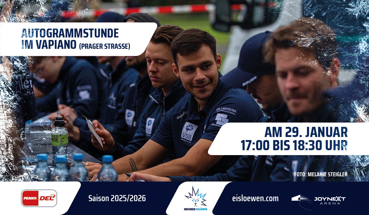 Am 29. Januar 2026 steigt die nächste Autogrammstunde unserer Eislöwen! Unser Team wird bei unserem Partner Vapiano auf der Prager Straße zu Gast sein und dort für Autogramme und Fotos zur Verfügung stehen. Kommt vorbei und sichert euch die Unterschriften eurer Lieblingsspieler!