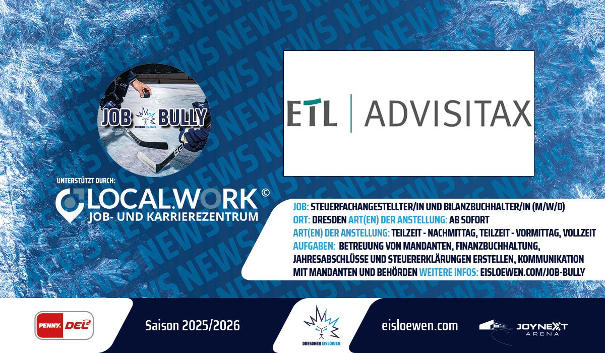 Gemeinsam mit LOCAL.WORK bekommen Eislöwenpartner und Firmen die Möglichkeit über die Webseite der Eislöwen neue Mitarbeiter zu gewinnen. Das nutzt auch unser Partner, die ADVISITAX Dresden GmbH auf der Suche nach einem Steuerfachangestellten und Bilanzbuchhalter (m/w/d). Das aktuelle Job-Angebot ist über Stellenbeschreibung einsehbar.