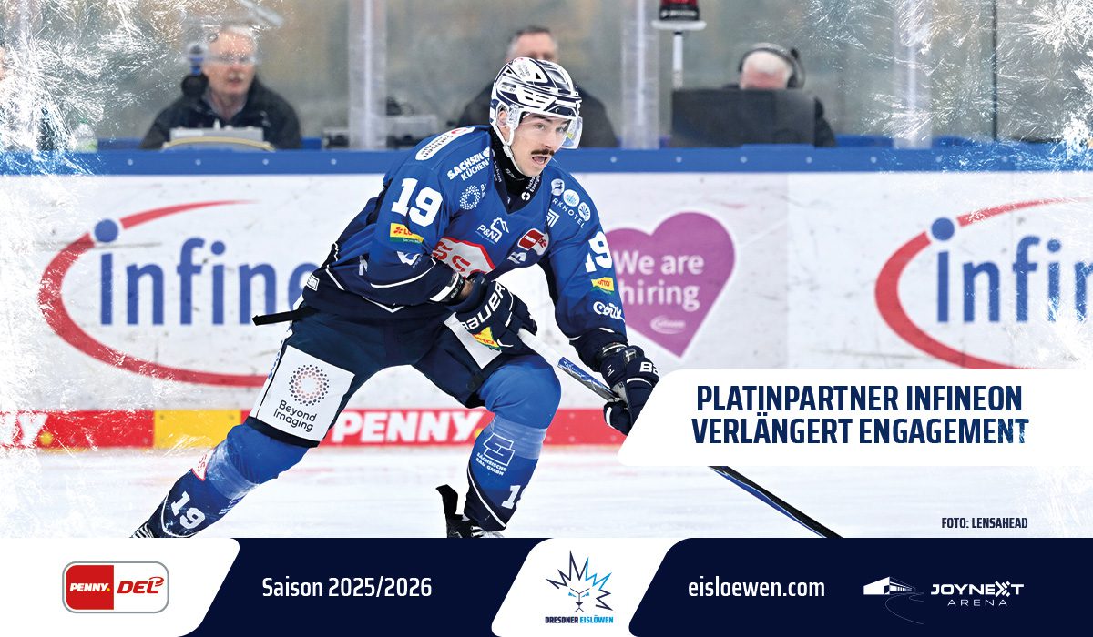 Die Dresdner Eislöwen und Infineon Dresden setzen ihre erfolgreiche Zusammenarbeit fort. Das Unternehmen bleibt Platinpartner der Eislöwen und verlängert sein Engagement um weitere drei Jahre. Damit setzt Infineon gerade nach dem sportlichen Abstieg ein starkes Zeichen für den Standort Dresden und die langfristige Partnerschaft mit dem Dresdner Eishockey.
