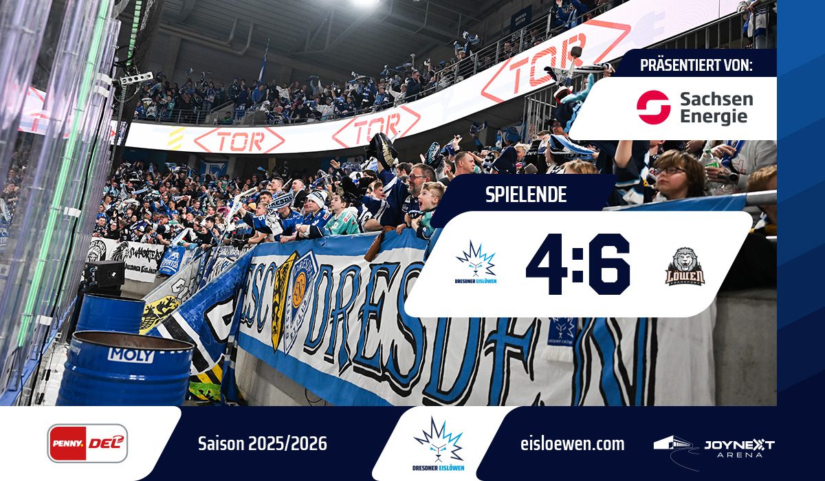 In der 43. Minute erhielt Frankfurts Cameron Brace eine Strafe wegen Hakens, das Powerplay konnte aber nicht genutzt werden. Nach einem Stockschlag musste Eislöwe Karlsson in die Kühlbox, das Unterzahlspiel überstanden die Sachsen problemlos. Kurz darauf folgte die nächste Strafe gegen Dresden, Grund waren zu viele Spieler auf dem Eis. Die Hessen nutzten das Powerplay und Nathan Burns (55.) netzte die Scheibe ein. Die Eislöwen versuchten noch einmal alles und Austin Ortega (56.) traf zum Anschluss. Dresden nahm zugunsten eines weiteren Feldspielers Goalie Schwendener vom Eis. Den Umstand des leeren Tores nutzten Wedman (59.) sowie Brace (60.). Kurz darauf verkürzte noch Matthias Pischoff, sein erster Treffer in der PENNY DEL. Am Ende gewann Frankfurt mit 6:4.