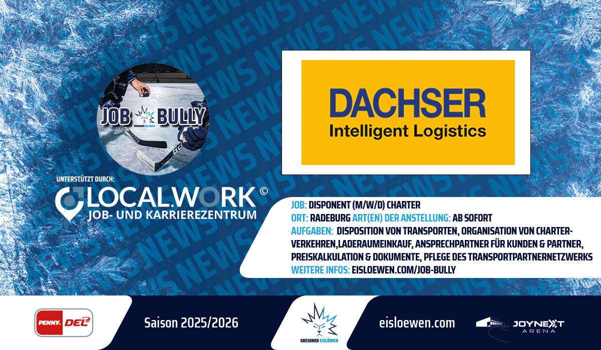 Gemeinsam mit LOCAL.WORK bekommen Eislöwenpartner und Firmen die Möglichkeit über die Webseite der Eislöwen neue Mitarbeiter zu gewinnen. Das nutzt auch unser Partner, DACHSER SE auf der Suche nach einem Disponent (m/w/d) Charter. Das aktuelle Job-Angebot ist über Stellenbeschreibung einsehbar.