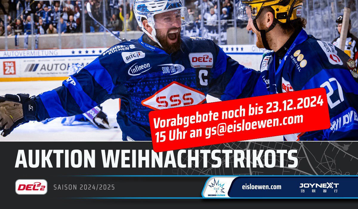 Denkt dran, liebe Eislöwenfans! Am 26.12. nach dem Heimspiel gegen die Blue Devils Weiden werden unsere Original-Weihnachtstrikots in der JOYNEXT Arena versteigert!